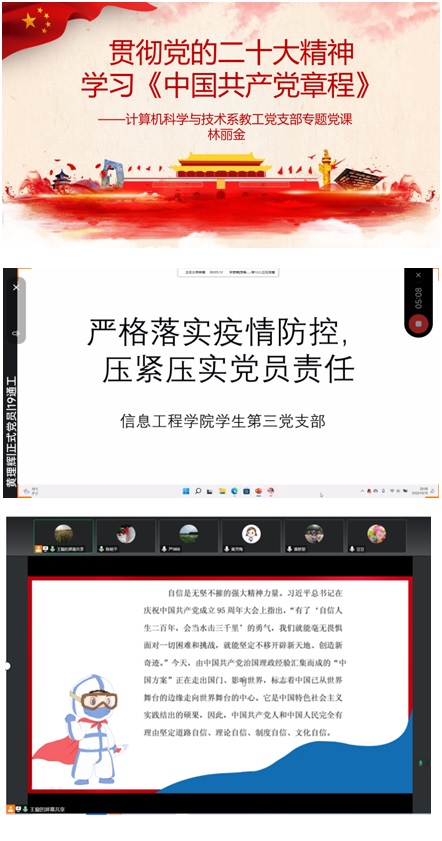 因疫情防控启动线上教学以来,beat365官网党委带领各党支部开展党的二十大精神线上专题学习、集体研讨、专题报告、微党课、主题党日活动等灵活多样的线上学习活动7场。各支部在学习中能够深刻解读党的二十大的核心要义和丰富内涵,认真学习党章,并结合当前面临的防疫形势,引导广大师生正确把握“坚持人民至上、生命至上,坚持动态清零不动摇”的防疫政策,号召广大师生以更坚定的意志、更昂扬的斗志投入到抗疫工作中。学院再次启动疫情期间教师党员志愿者线上教学督导,成立了3支学生党员志愿服务队,协助进行心理疏导、场外核酸检测引导和日常秩序维持等,充分发挥基层党组织坚强战斗堡垒和党员先锋模范作用,为维持学院良好线上授课秩序保驾护航。